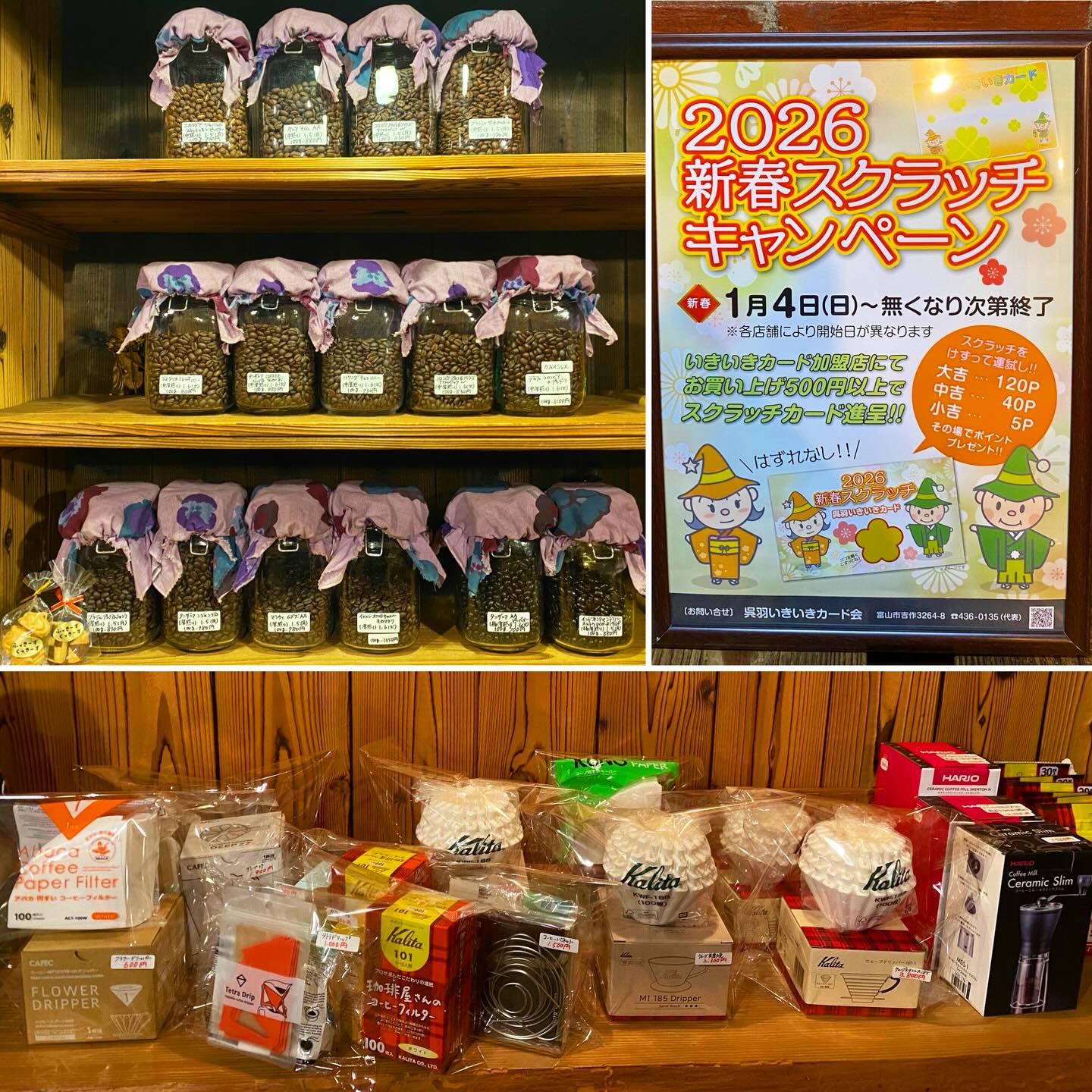 店頭では〝呉羽いきいきカード〟のスクラッチを500円以上お買い上げのお客様にお配りいたします。珈琲道具を普段よりお得にご案内。そして〝ふっきーずくっきーず〟のクッキーをお配りいたします。お楽しみに。