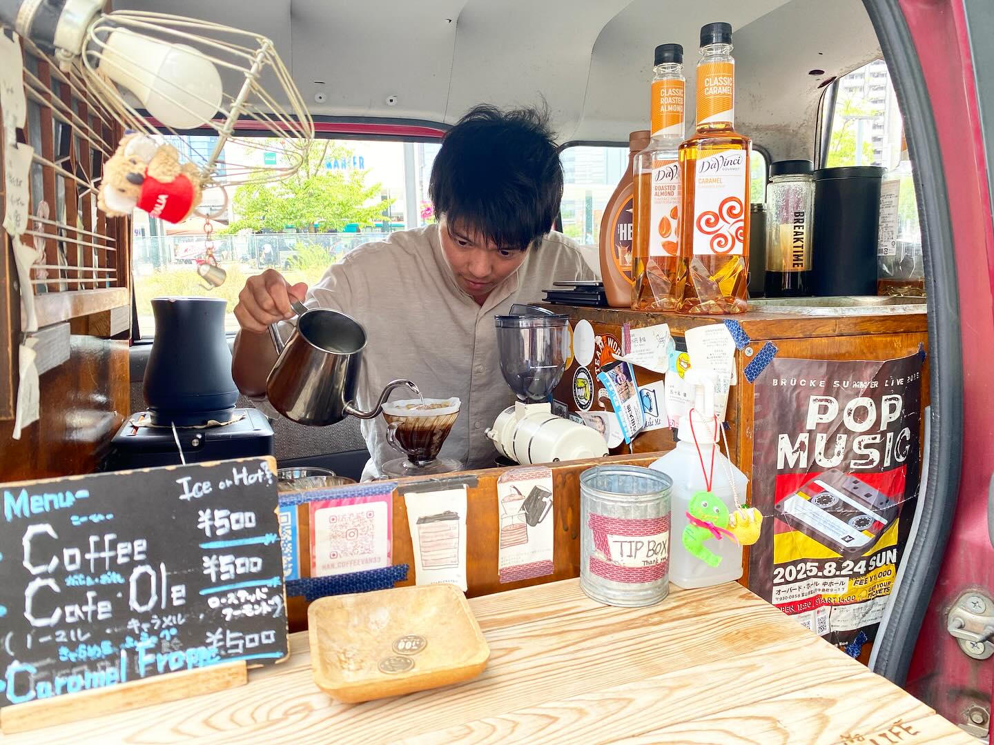 2025.7.18 定休日です。営業準備を一旦とめて、配達や用事、買い物へ。タイミングよく寄れた久しぶりの〝かんのくるま〟気になっていたクラッシュアーモンドが添えられたキャラメルフラッペを選びつつ、ボトルにはホット珈琲を淹れてもらい持ち帰り。