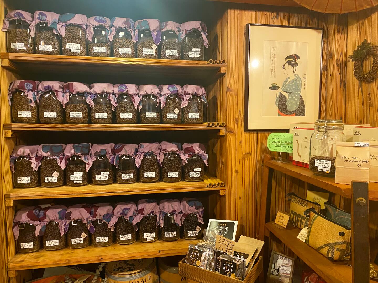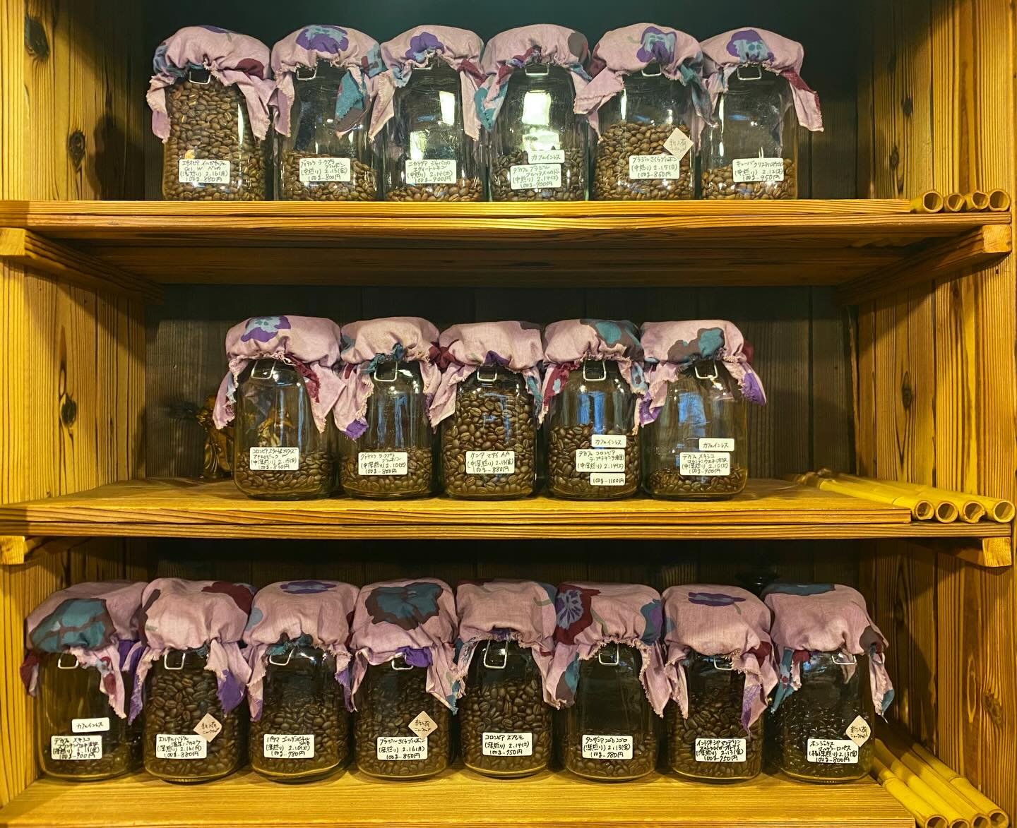 2025.12.22 開店前の珈琲ラインナップです。空瓶にはこれから仕上げる珈琲が入ります。珈琲需要の高まり…ありがとうございます。