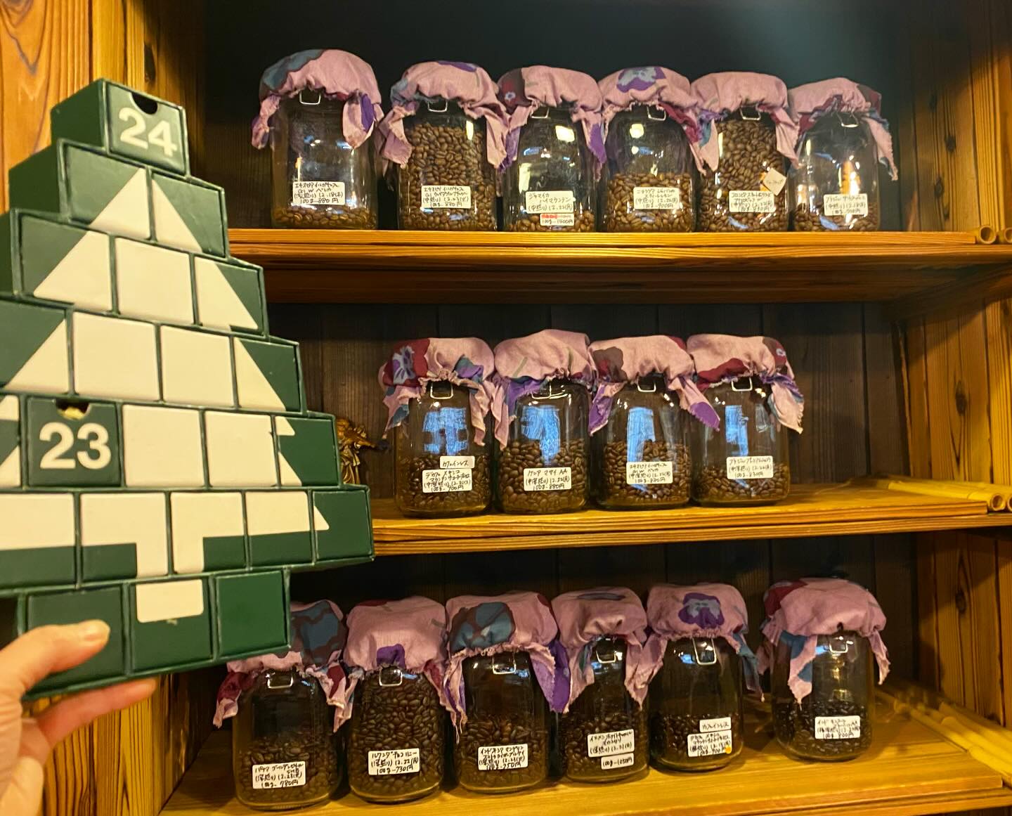 2025.12.23 クリスマスを待つアドベントカレンダーも残りふたつです。そして珈琲ラインナップはご覧の通りです。新鮮な珈琲が並びました。