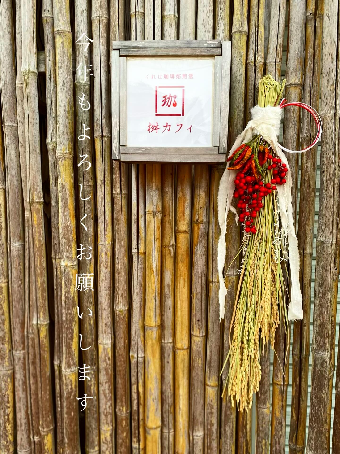 喪中なのでいつもとは違い控えめな初まりです。お客様にご用意していただいた〝ライスファーマー山上〟の稲穂を使ったしめ飾りです。店前のみお飾りを。