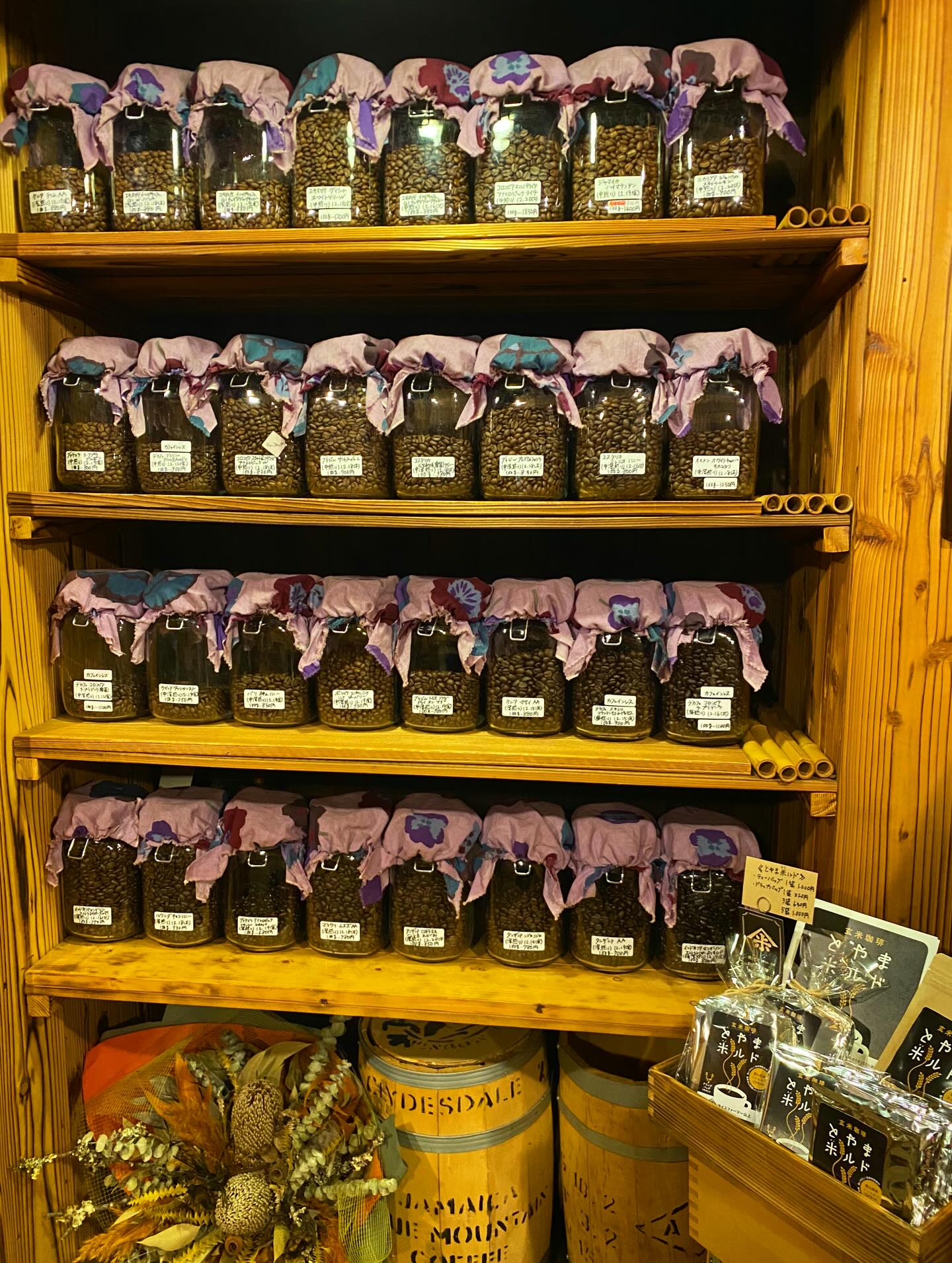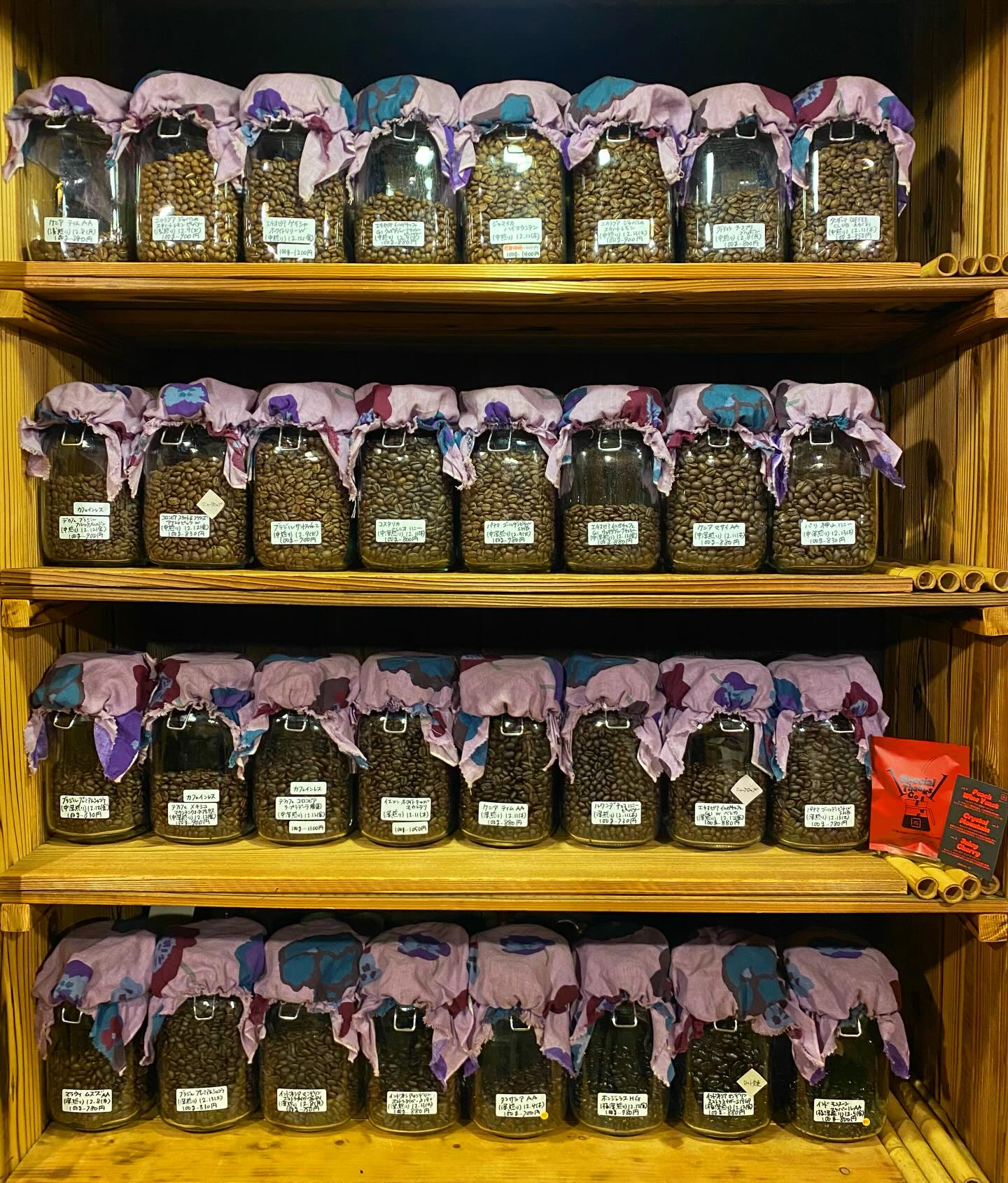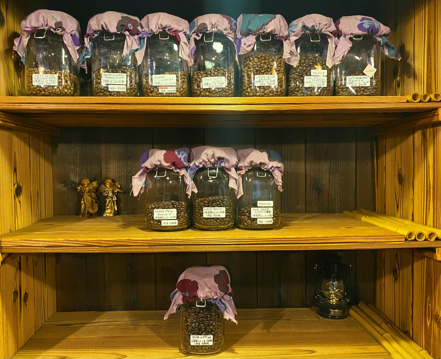 2025.12.22 開店前の珈琲ラインナップです。空瓶にはこれから仕上げる珈琲が入ります。珈琲需要の高まり…ありがとうございます。